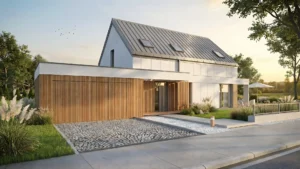 Wysoce energooszczędny dom parterowy z poddaszem użytkowym o powierzchni 146 m², stworzony z myślą o 4–5 osobowej rodzinie. Projekt w standardzie pasywnym łączy komfort życia z funkcjonalnym układem wnętrz oraz niskimi kosztami eksploatacji, dbając jednocześnie o środowisko.