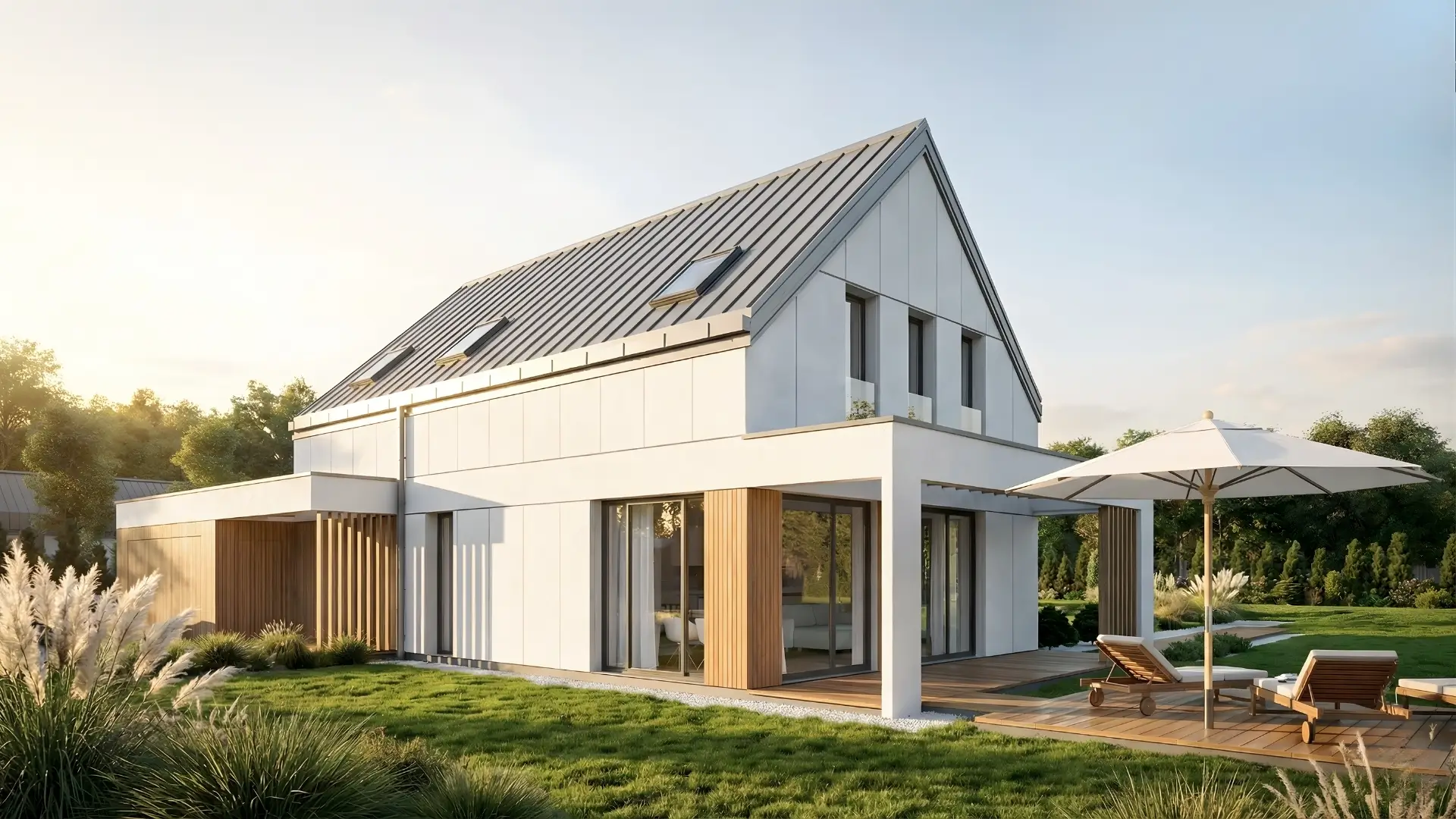 Elewacja domu wyróżnia się zwartą bryłą z bezokapowym dachem i nowoczesną, jasną ścianą, urozmaiconą wielkoformatowymi przeszkleniami oraz efektowną ramą tarasową z pionowymi, drewnianymi lamelami, co nadaje budynkowi elegancki, minimalistyczny charakter.