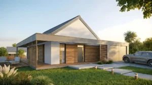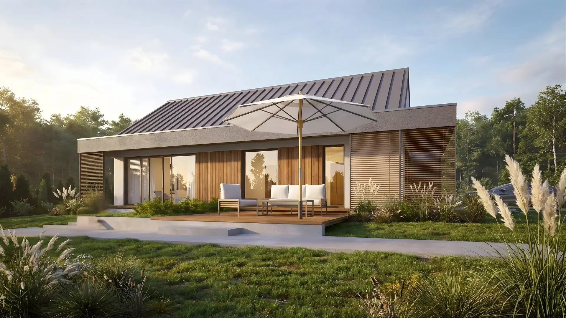 Kompaktowy, wysoce energooszczędny dom parterowy o powierzchni 93 m², stworzony z myślą o 2–3 osobowej rodzinie, zapewniając wygodę i funkcjonalność codziennego życia. Zastosowane rozwiązania energooszczędne obniżają koszty ogrzewania i wspierają przyjazne środowisku użytkowanie domu.