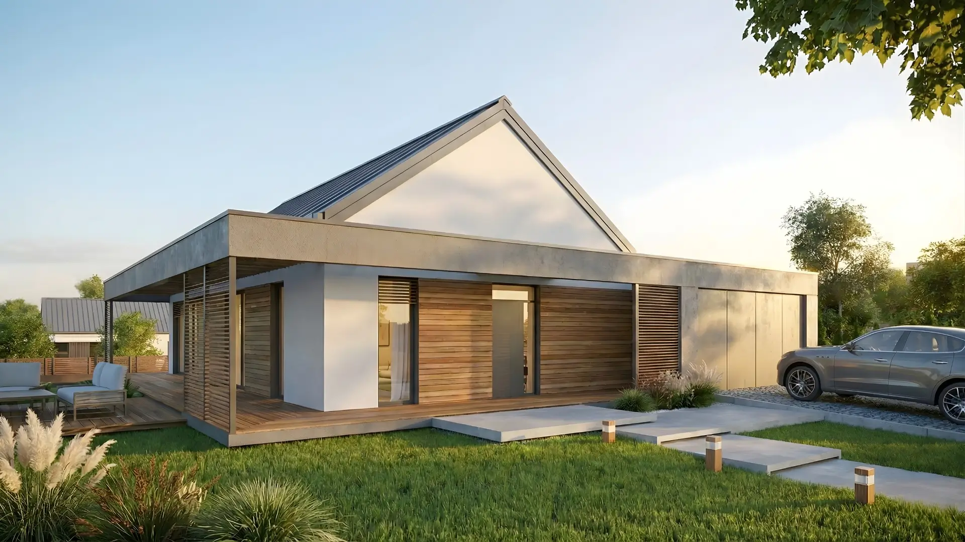 Dom wyróżnia się nowoczesną, minimalistyczną bryłą z dwuspadowym dachem. Jasną, tynkowaną elewację przełamują naturalne drewniane akcenty w układzie poziomym, nadając całości elegancki i ponadczasowy charakter.