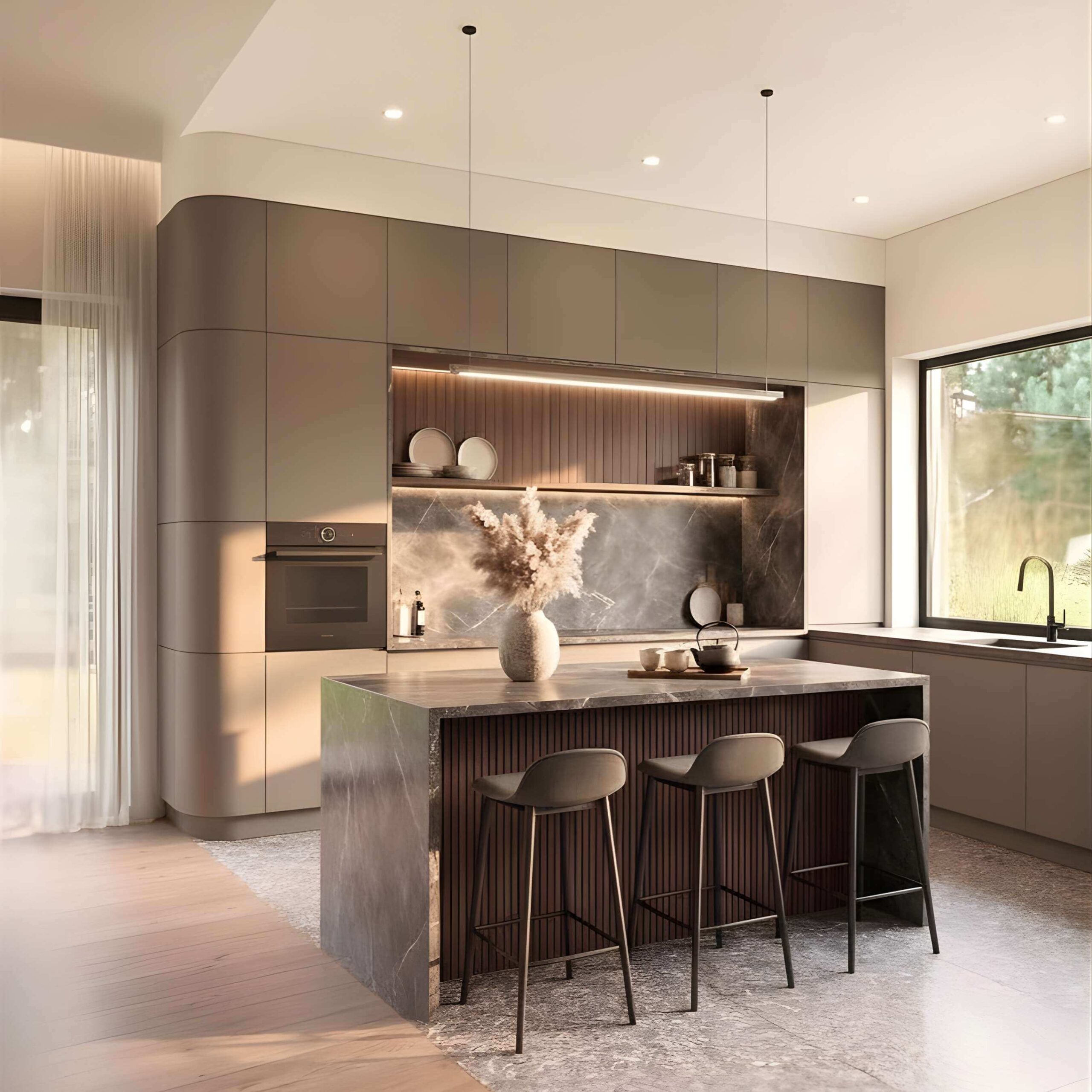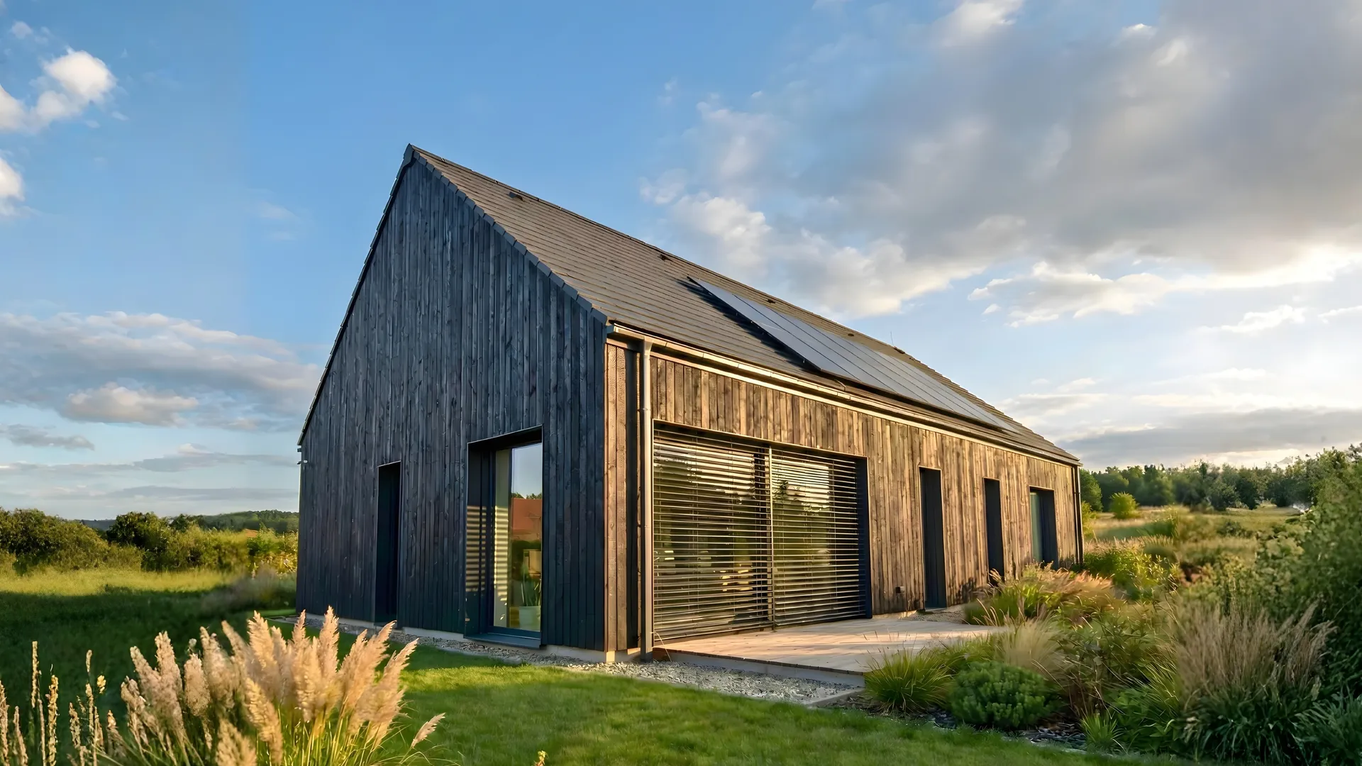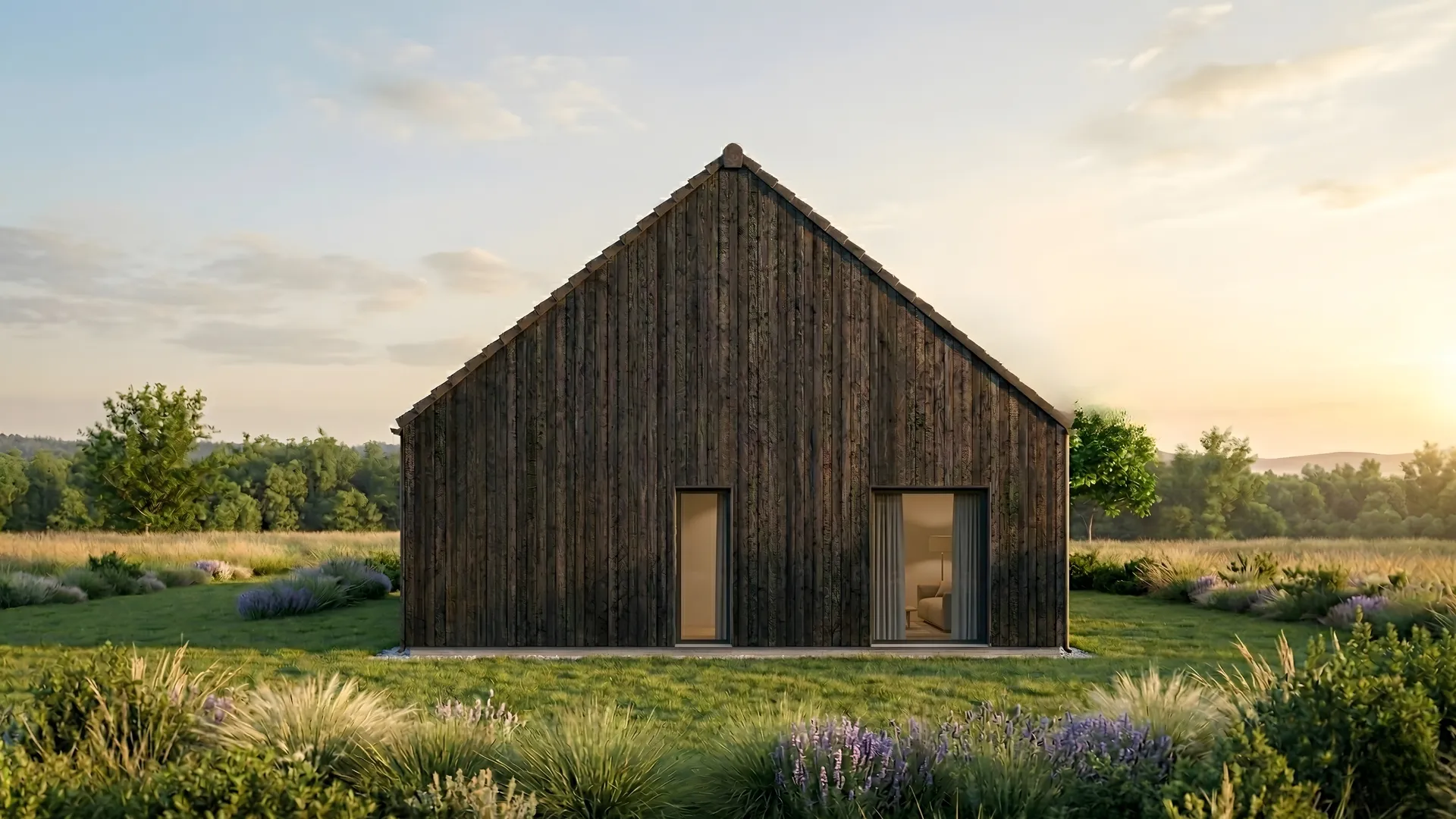 Elewacja domu przyciąga uwagę szlachetną strukturą drewna opalanego tradycyjną japońską techniką Shou Sugi Ban. Głęboka, aksamitna czerń pionowych desek podkreśla nowoczesną bryłę budynku, nadając jej wyrafinowaną, ponadczasową elegancję. W połączeniu z dużymi przeszkleniami elewacja tworzy spójną, luksusową kompozycję o wyjątkowym charakterze.