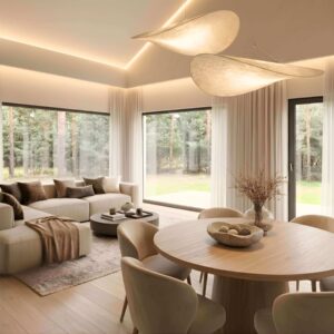 Sercem domu jest przestronny salon z efektownym sufitem katedralnym i otwartą przestrzenią. Takie rozwiązanie nadaje wnętrzu wyjątkowej skali oraz elegancji. Nowoczesna kuchnia z oknem panoramicznym płynnie łączy się z częścią dzienną. Bezpośrednie wyjście na taras południowo-zachodni zapewnia doskonałe doświetlenie strefy wypoczynkowej. Duże przeszklenia sprawiają, że wnętrze domu naturalnie przenika się z otaczającym go ogrodem. To idealna przestrzeń do codziennego relaksu oraz spotkań z rodziną i przyjaciółmi.