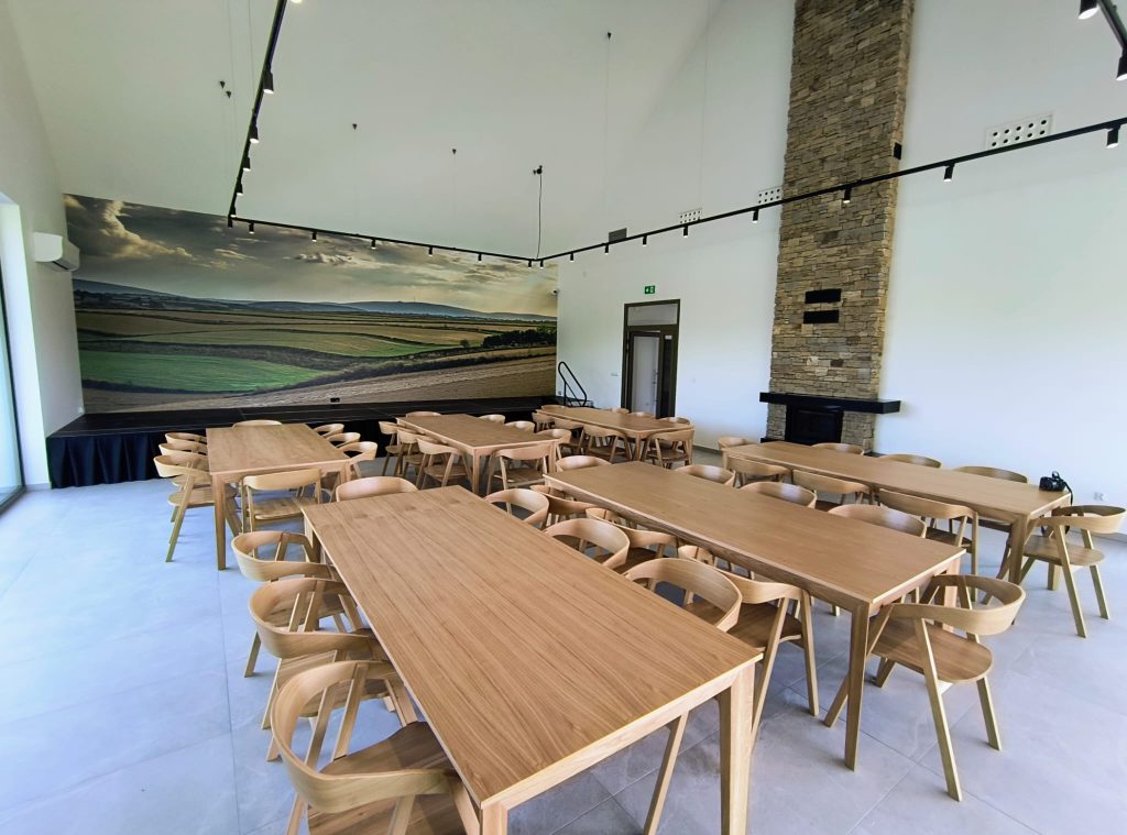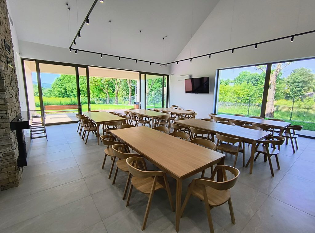 Główna sala kominkowa o pow. 100 mkw z wysokim sufitem katedralnym oraz nowoczesnym oświetleniem na podwieszanych szynoprzewodach, ściany dekoracyjne z czarno-białymi fotografiami meble z litego drewna dębowego.