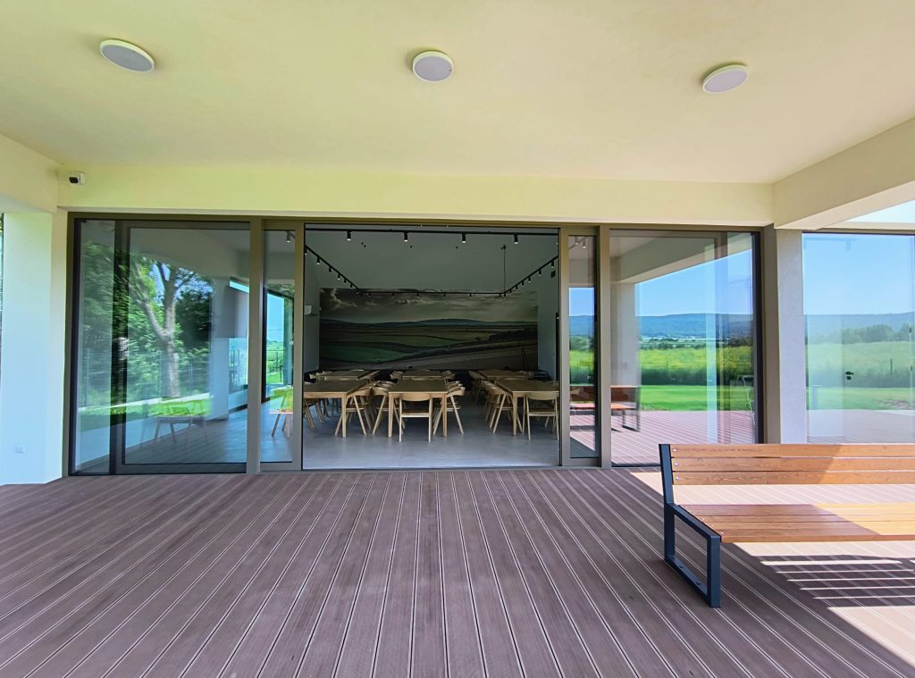 Imponująca wielkość przeszkleń na południowej elewacji: panoramiczne okno HST o szer. 9,5 m wraz z sąsiednim fix szer. 2,1 m i kolejnym HST szer. 3,7 m (wszystkie okna wysokości 3,2 m), stanowi fantastyczną ramę widoku na Góry Świętokrzyskie.