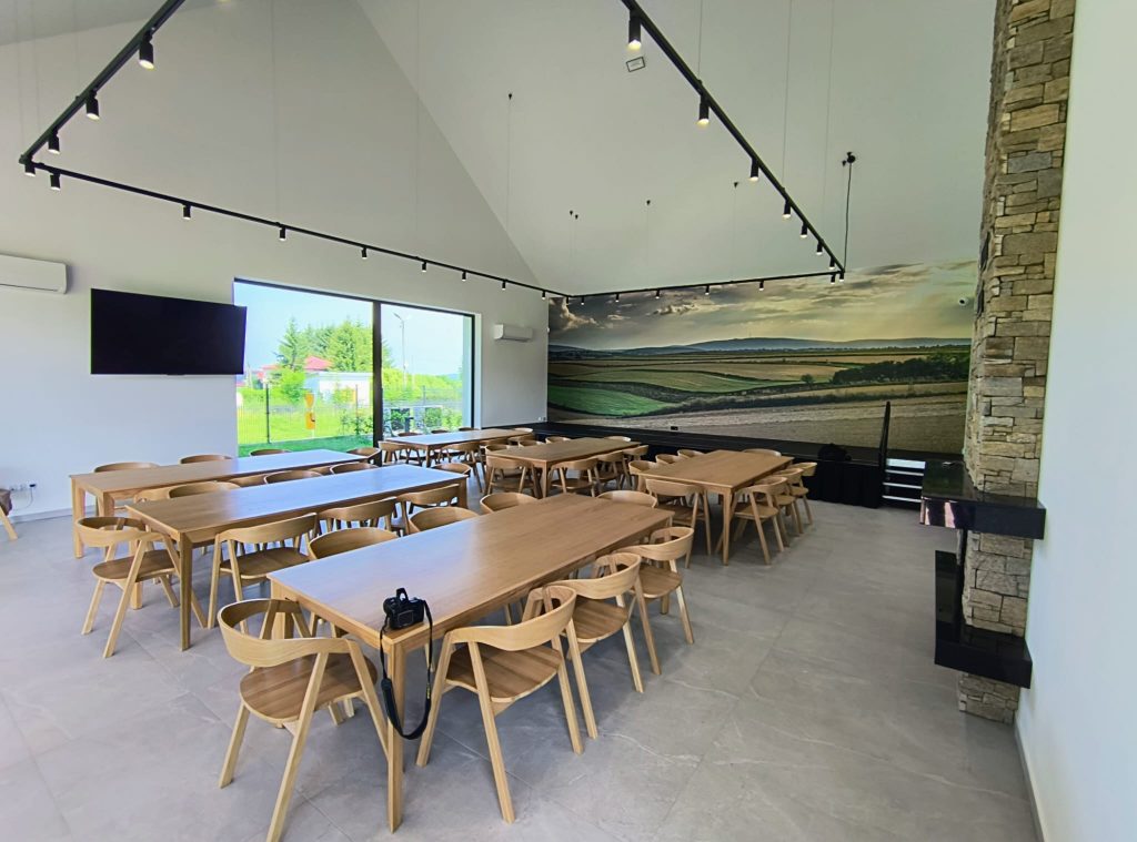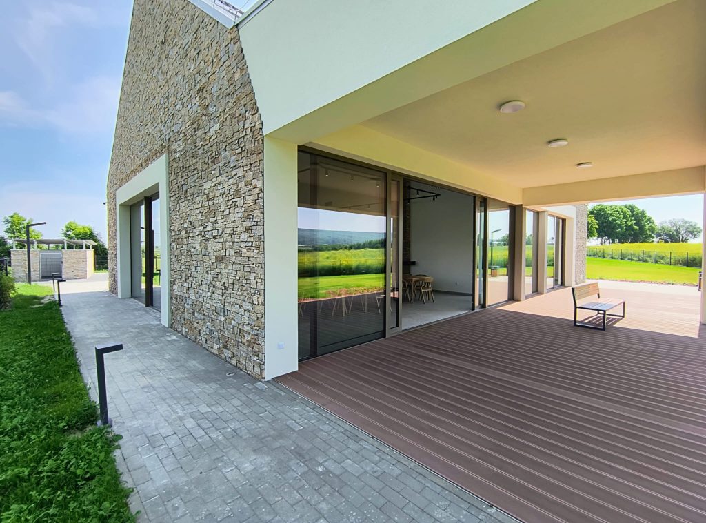 Budowa ruszyła w latem (06’24 r.), a po pół roku (01’25 r.) został osiągnięty stan surowy zamknięty (SSZ) i były prowadzone prace wykończeniowe wewnątrz. Na elewacji zastosowano kamień naturalny w kolorze beżowym z szerokimi opaskami okiennymi, tak aby zachować lokalny styl architektoniczny, a jednocześnie nowoczesnej stodoły.